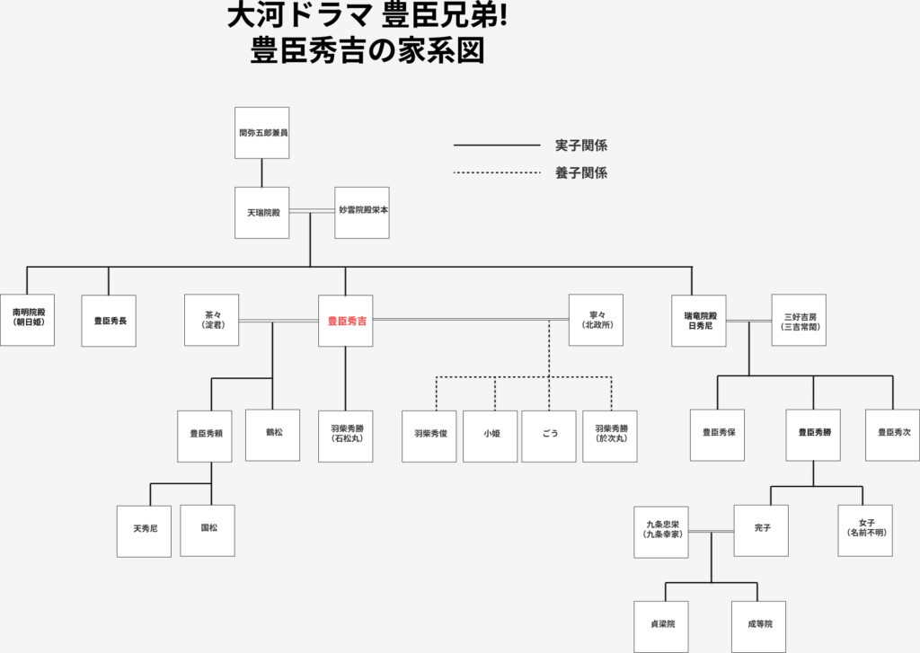 また大河ドラマ「豊臣兄弟!」の主人公である豊臣秀長を中心とした家系図は下記の記事が参考になります。