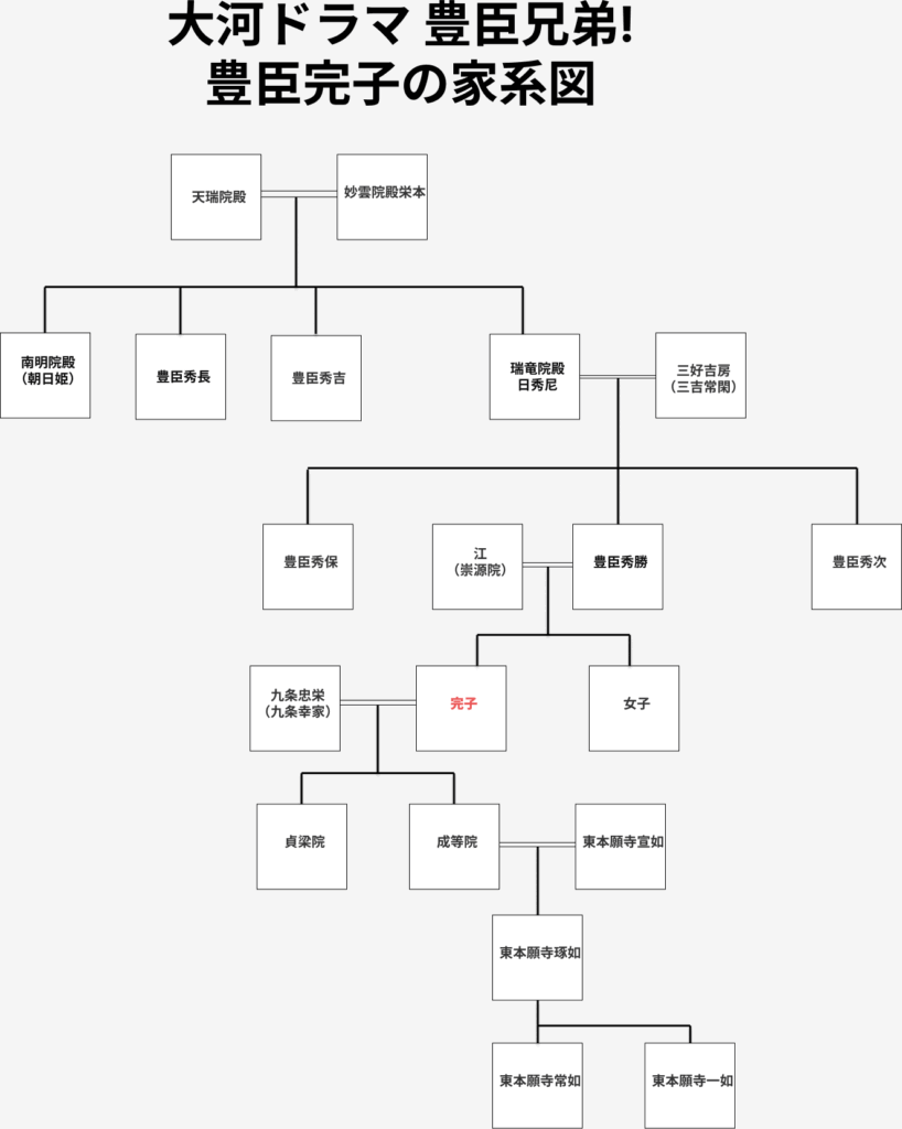 完子の家族について豊臣家側の人間と九条家側の人間に分けると以下の通りとなります。